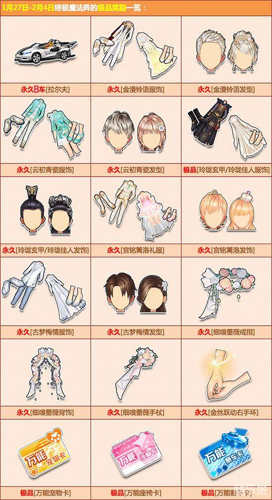 1月27日-2月4日期间,终极魔法阵奖励再更新,一大波极品套装、极品饰品、极品宠物等你来抢,千万不要错过哦!