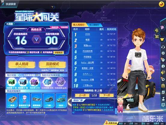 广大赛车手需要特别注意的是,星际大闯关是一个带有自我成长的玩法,每次跑出历史新高成绩,第二天挑战的起点都会向前挪数关,使得第二天很容易创造新高成绩,进而推进第三天的起点,更容易创造新高成绩。因为有这个循环体系,所以只要坚持每天发起挑战,大多数玩家在一段天数后都能到达50关!到达50关!到达50关!重要的话讲三遍~