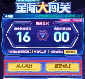 星际大闯关支持单人挑战和双人互助两种挑战玩法,可从游戏主页的左上角“星际大闯关”入口快速进入,或在小橘子桌面中点击“星际大闯关”参与。