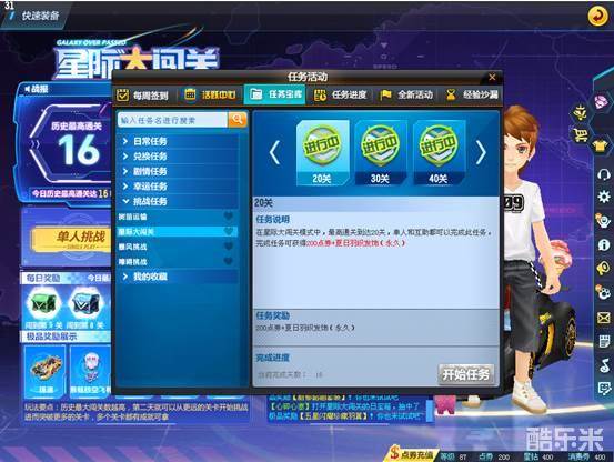 星际大闯关里具有通关任务和相应的成就,挑战任务里有专属的套装等你领取,每日挑战还可在宝箱里开出极品奖励。