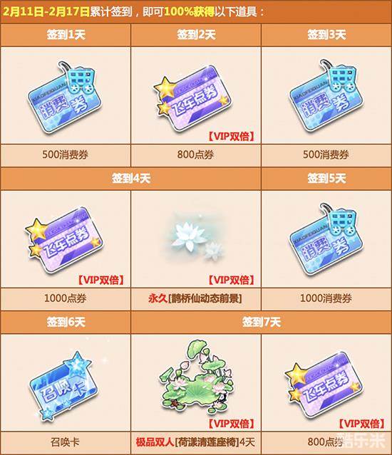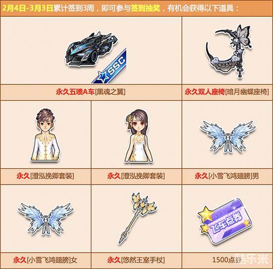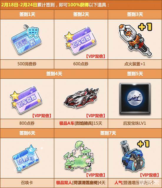2月4日起,每天登录游戏完成签到任务,即可获得丰厚的点券奖励、人气道具、极品A车和双人座椅福利!