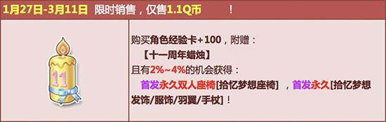 QQ飞车11周年庆来临!1月27日-3月11日,在飞车商城购买【角色经验卡+100】,赠送【十一周年蜡烛】,开启有机会获得首发永久双人座椅【拾亿梦想座椅】、永久首发【拾亿梦想发饰/服饰/羽翼/手杖】!其中核心极品期限型概率范围为:4%-6%,核心奖励永久型概率范围为:2%-4%,非核心奖励概率范围为:90%-94%!