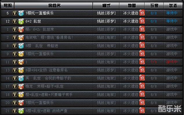 冰火遗迹一更新挑战频道都爆满了,各种各样的房间遍地都是,有速刷、站撸的等等,但是普遍要求都很高。樱、超新星、N黑骑士这些挑战玩家必备的装备其他玩家几乎不会凑太齐,而房间的要求一个比一个高这又要装备不够的玩家怎么打法?