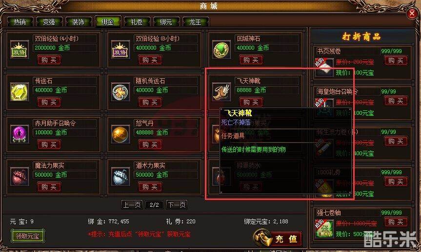 玩家完成主线任务的过程,系统会赠送一些飞天神靴给玩家,当然大家平时若需要用到这种道具,可以进入到商城的绑金栏去购买,每组99个飞天神靴售价为88888金币。如果玩家成为任意等级的VIP等级,将可以不用飞天神靴,每天都可以无限次享受快速传送功能哦。