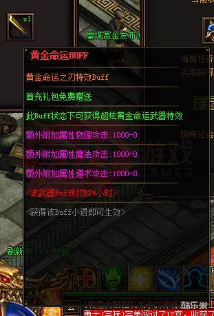 玩家双击【黄金命运BUFF】道具,可直接对其进行使用,玩家可小退一下,便能获得相应的特 效。其特 效是额外附加给角色的武器1000-0点的物理攻击、魔法攻击、道术攻击3种属性效果。另外,在获得该BUFF同时,角色武器造型会拥有超炫黄金命运武器的特 效造型,是非常之拉风的。有一点不足之处就是这种黄金命运之刃BUFF仅有24小时的时效,超出时效将会自动消失。