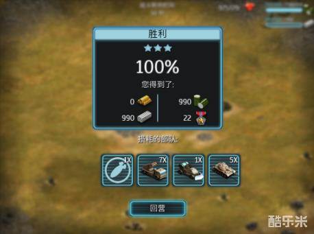 当战斗结束时,根据战斗结果展示战斗结算画面,包括战斗胜利和失败。结算界面包括:战役完成情况、获得石油资源、获得钢铁资源、获得黄金资源、获得勋章数。