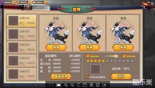 2、每只坐骑都有凡品、珍品、圣品三个品阶,可通过进化提升品阶;