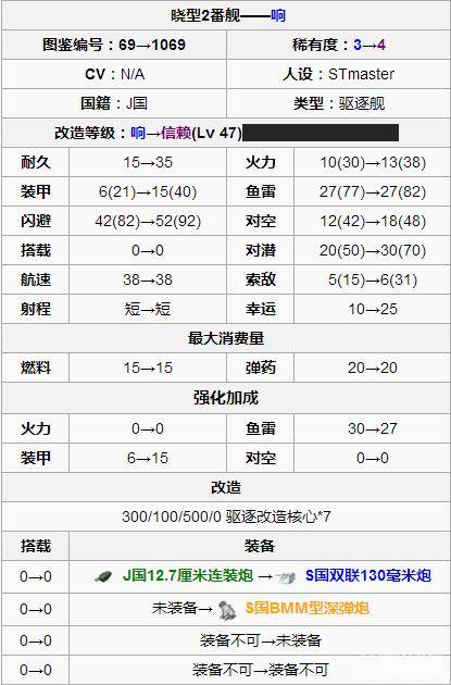 相比晓来说,信赖的技能让她更偏向单点保护,这让她可以有更多登场空间。属性不俗技能不俗,信赖相对较稳,当然级别低还是会假摔,改造后送金反潜,本来楼主是有大规模养殖计划的,可是自打定下计划之后就没见过响爷,,新版本标枪改造后也送金反潜,而且标枪改造等级更低更容易捞,响爷的养殖计划可以放一放了。