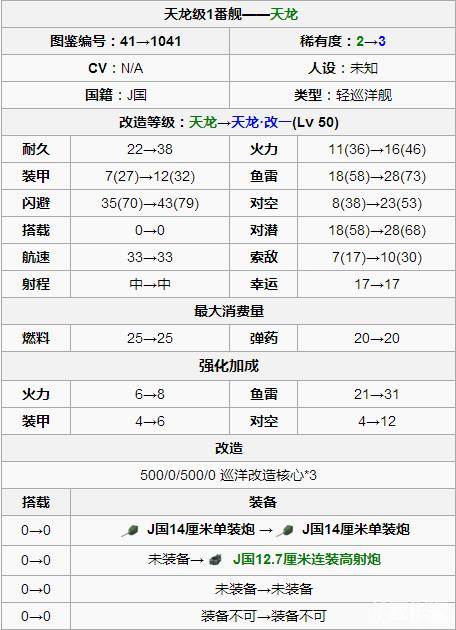 战舰少女历史老巡洋舰的天龙数据解析,真·远征少女时代,从天龙改开始。作为一艘历史上的老巡洋舰,在游戏里曾经非常不出彩,作为狗粮强化的数值感人,分解吧,结果上个版本开放改造,一跃变成二队、三队、四队的旗舰了。聚沙成塔还是比较可观的,改造后装备无亮点,建议改造并强化满两只到四只天龙改。