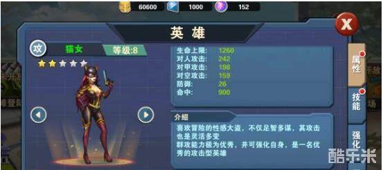 身为一个B级的攻击型英雄,猫女却有着接近S级的战意成长,在游戏前期是个非常出色的助攻型英雄。猫女是一位喜欢冒险的性感大盗,不仅足智多谋,其攻击也是灵活多变。而且群攻能力极为优秀,并可强化自身,是一名优秀的攻击型英雄。在游戏的前期也是一位值得培养的过渡型英雄。