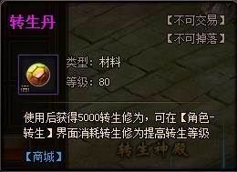 玩家使用转生丹可以获得5000转生修为,可以在角色——转生界面消耗修为来提升转生等级。