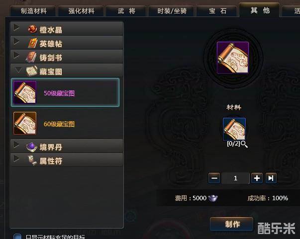 在日常征战副本中,玩家有机会获得一张“藏宝图”的道具,藏宝图是有等级的,分别为40、50、60级,当然,60级的藏宝图挖到好宝贝的几率高很多。所以,建议玩家在前期的时候呢,把藏宝图囤起来,全部在制造中合成60级的,接着就是坐等60级了。