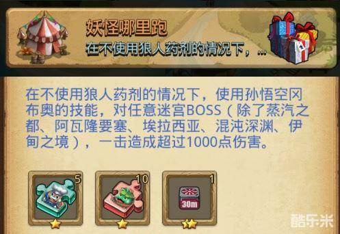 任务:不使用狼人药剂,使用孙悟空冈布奥技能,对任意迷宫boss一击造成1千点上海,除蒸汽之都、阿瓦隆要塞、埃拉西亚、混沌深渊、伊甸之境。