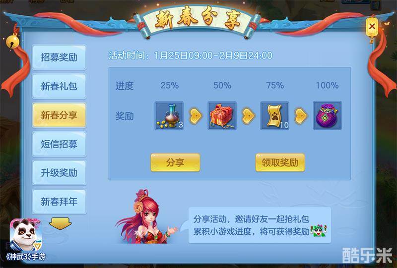 1月25日09:00至2月9日24:00,老玩家从游戏内将H5分享至微信好友、朋友圈,邀请好友体验“‘猪’你一飞冲天”小游戏累积奖励进度,当祈福进度达到25%、50%、75%、100%时,便可在游戏内分享界面领取对应的奖励。