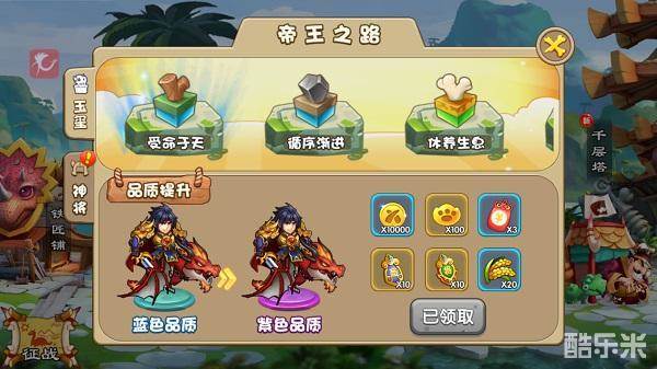 帝王之路是见证玩家成长的一个重要系统,在玩家不断挑战的过程中,可通过帝王系统领取成长记奖励,同时,帝王之路中的玉玺,也是主将提升品质的唯一途径。