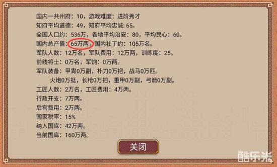 可以看到,仅仅换了一个地方知府,国内的总产值就上涨了三万两。是的,和我们所学的史实、所看的电视剧一样,天高皇帝远,地方知府的道德属性非常重要,直接影响到了国内的总产值,道德高的知府也不容易形成贪污腐败风气。所以各位小伙伴们在调换知府的时候,一定要换道德高的当知府噢。