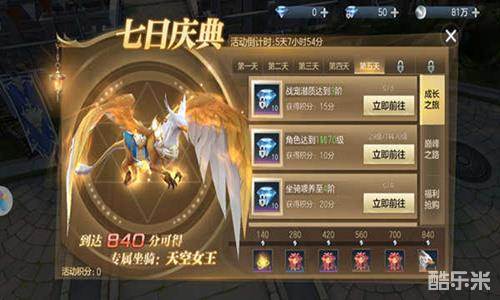 加入游戏,自角色创建后10天内,完成指定任务、购买礼包可获得积分奖励,积分累计达到相应分值即可领取终极大奖—永久坐骑“天空女王”!在角色创建后7天内,每天登录更有惊喜连连,炫酷翅膀、强力武器、专属坐骑,应有尽有!你升级我买单,升级到指定等级、达到指定战力,均可领取超级大礼包!