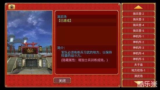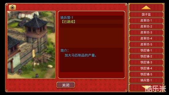 骑兵营:建好【陵寝】后解锁,有1-5级,后期三大骑兵、轻、重、铁骑都需要战马,骑兵营能增加马匹的产量,由于每个回合制造的武器只能有一种,所以这部分的建筑对于快速成立百万军队还是很有帮助的。