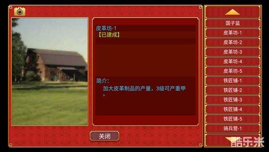 皮革坊:建好【陵寝】后解锁,有1-5级,加大皮革制品的产量,同上。建到3级的时候可以生产重甲,重甲是一些精锐部队所必需的物品,精步兵、火炮兵、重骑兵和铁骑。后期打仗这些军队的战斗力十分高,所以皮革坊也要尽早建起来。
