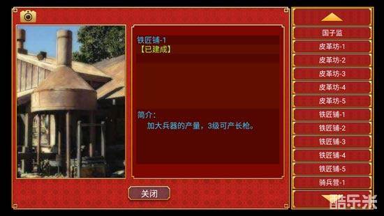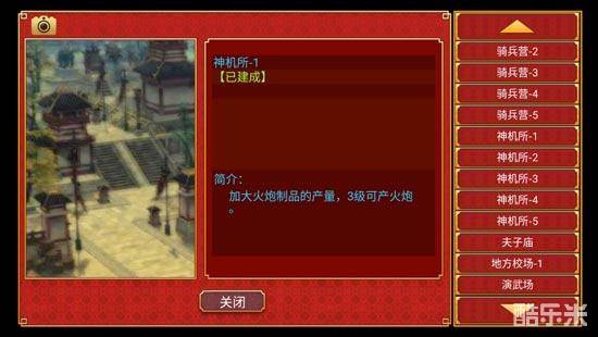 神机所:建好【陵寝】后解锁,有1-5级,3级可生产火炮,需求性同上,是火枪兵、火炮兵、铁骑的必要物品。