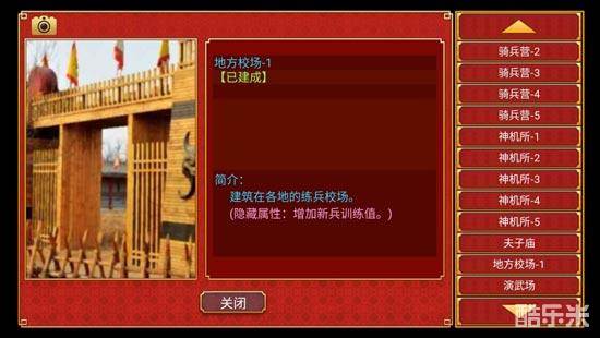 地方校场:建好【陵寝】之后解锁,有1-6六个等级。和演武场一样是快速增加训练值的建筑。每次征召士兵时,由于涌入大量的新兵所以训练值都会大幅度下降。地方校场可以增加新兵的训练值,减少征召士兵后训练值的下降,在游戏后期对打仗很有帮助。