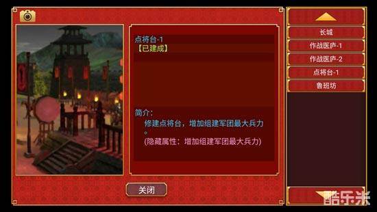 点将台:建好【陵寝后解锁】,简单粗暴,增加军团的最大兵力,一次能组建更多的士兵、战斗力更高的军队。