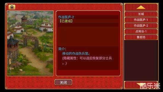 作战医庐:建好【陵寝】之后解锁。打仗都是刀枪对血肉,可以在战后恢复部分士兵。打仗都是刀枪对血肉,就算再强大的军队打仗都是会有巨大的损耗的,因此,作战医庐可以起到很好的续航作用,增加一个兵团的作战次数,提高打仗效率,在后期是很有用的建筑。