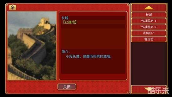 长城:建好【陵寝】之后解锁,没有隐藏效果,情怀建筑,但也是个前置建筑,建好后可以解锁【万里长城】。