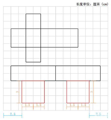 在上一步完成的长方形下方、画两个长3厘米高3厘米的方形