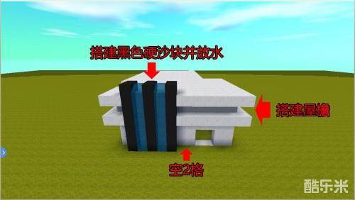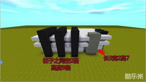 第三步:在最左边的那一面开个门,用黑色硬沙块搭建柱子并在柱子之间放水如下图所见进行操作;