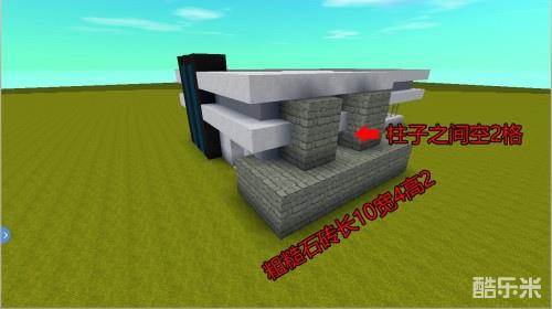 第四步:在门的右边用粗糙石砖搭建一个长10宽4高2的墙体并在上面搭建两个柱子(如下图所示);