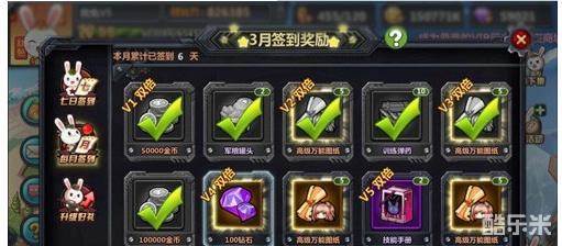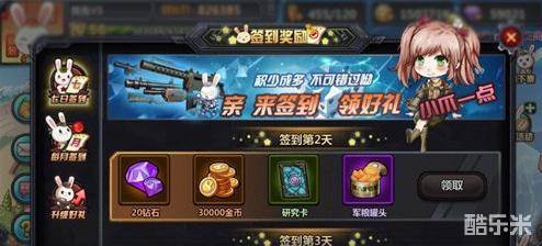 游戏中不同军衔每天都可以领取数量不等的钻石,一开始是10钻,军衔上升后,少尉可以领20钻,大尉则可以领30钻。基本上到了中期后,每个小伙伴每天有40钻石可以领取。当然啦,签到奖励也是大大的丰厚哦!每日签到即:七天一个循环,每天奖励都不同,但都是相当的实用的;下面就厉害了,每月签到,除了有很多小钱钱和高级工具外,还有兔亲们最关心的钻石,最高可以领取100钻呢,这样坚持下去,离土豪还会遥远吗?