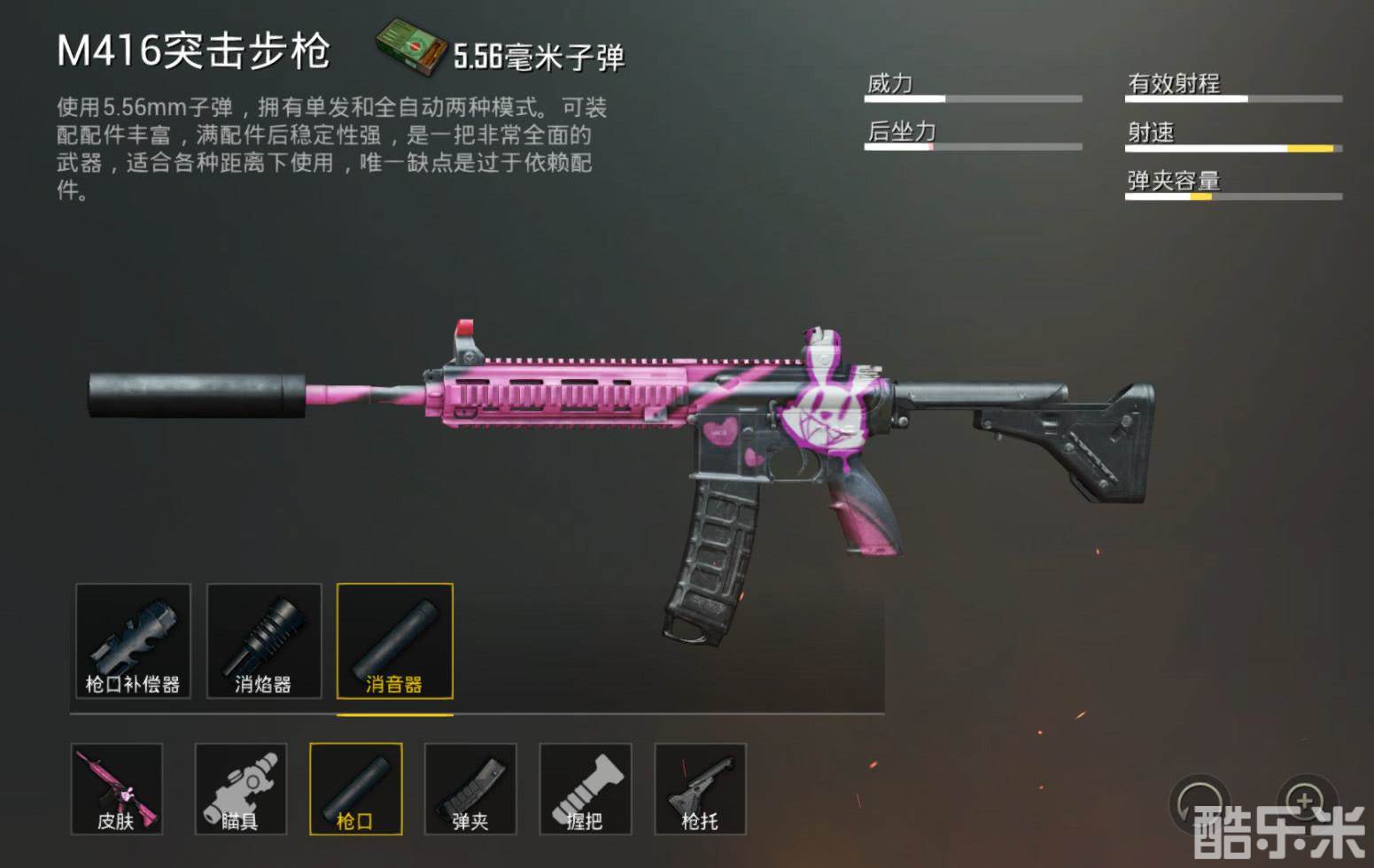 我们以配件最多的M416步枪为例,首先枪托和扩容弹夹没得选,都是十分重要的配件,需要选择的只有枪口和握把。枪口很多人都喜欢消音,而消音其实不会加任何的稳定性,大家纯粹是喜欢它的声音才用,稳定性加最多的是枪口补偿器,其次是消焰器。