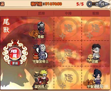 Ps:使用昼虎小李的好处就是不用调整怒印,也不用靠RP,只要用不死顶着,小李慢慢把昼虎叠上去,最后就是一下秒。用昼虎打八尾,只要有2只不死就可以,其余两只忍者随意,尽量选输出高点的,因为BOSS变尾巴了就不会攻击了,可以省下些不死次数,提供小李叠昼虎的机会。但要注意,小李必须是站最后一位,最后才死的位置。