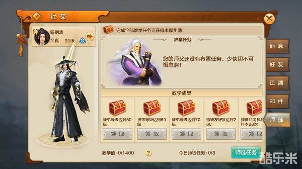 新玩家进入游戏后,33级时系统自动弹出对话框推荐是否拜师。想要当师父的玩家需要满足角色等级大于50级才可以收徒。