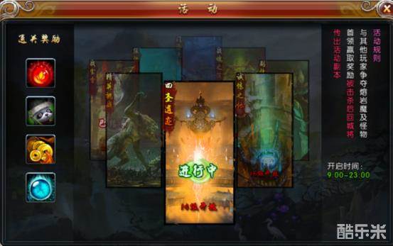 四圣遗迹PK抢夺活动进入时间:9:00-23:00 ,活动将进入一个公共地图,公共地图场景内,可以进行任意的PK和厮杀。整点时,游戏会出现首领大BOSS,击杀获得高级道具(如:银两,真气,宠物,战魂,还魂丹)。