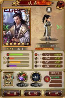 侠客里面有我们所收集的所有侠客,通过点击侠客可以获得该侠客的所有信息。点击详情可以看到该侠客的所有成长属性以及目前属性。就算是五星侠客,成长也差距很大,优秀的五星侠客成长高。这里建议所有上阵侠客的等级必须跟着主角走(比主角高五级)。最大化的提高战力!!