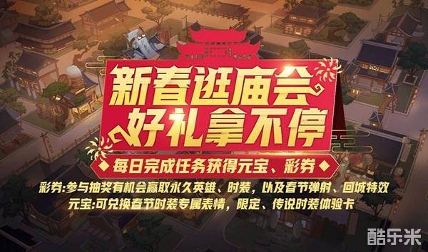 一年一度的非都庙会开幕啦!1.30 更新后 ~ 2.13 04:00,完成庙会中的各个景点的任务均可获得道具“彩券”和“爆竹”,“彩券”可用于在欢乐转盘抽奖,有机会抽出永久英雄、时装、春节专属回城特效、弹射特效!