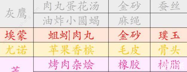 经过我这段时间的实验得出结论,一个特殊食物可以出两种材料,小圆蝎和烤鱼的另一种材料没有探险到很抱歉,但是已经知道是什么了,小圆蝎的第二个材料是暗色的矿砂,有点像金砂,烤鱼的第二个材料是一个晶。(也可能是反过来的)