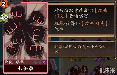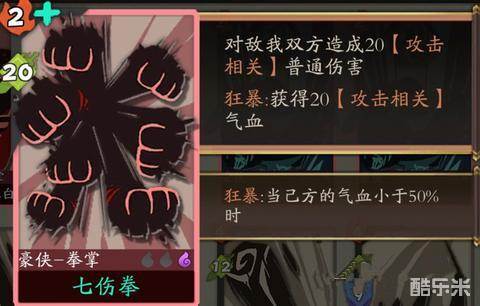 点评吐槽:万恶之源,游侠一生之敌-鸠摩智的隐藏武学,不过,您老的小无相功呢,七伤拳什么鬼,你是哪里来的金毛狮王啊,摔!2怒20伤,简单粗暴,自损20对于目前普遍携带虚竹出战的豪侠来说完全不痛不痒,何况狂暴之后等于无自损,升星加伤害,升级加狂暴回复。类比3怒打8的中立刺剑,4怒打16的中立刺棍,伤害十分可观。可惜的是目前豪侠各个套路实在都太强了,成型之后根本不需要它,只能用作中期过渡。紫卡,方便抓取,价格中等。