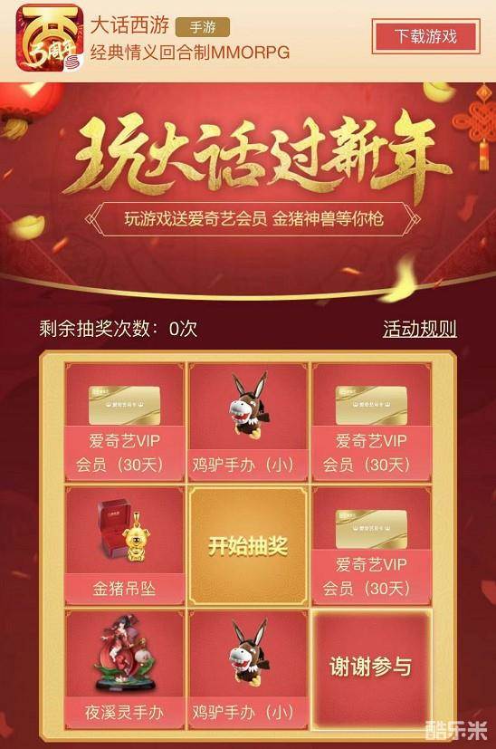 2019年春节玩大话,六福珠宝联名足金金猪带回家!更有500份爱奇艺VIP会员(30天)、珍贵的夜溪灵手办、鸡驴大神公仔(小)等你来拿!即日起的活动期间,玩家每日用微信打开一次活动页面就可以免费得到1次抽奖机会,分享页面给好友可再获得1次抽奖机会,而下载游戏更可以获得3次抽奖机会!春节玩大话,好礼相送,快快用微信扫码参与活动,伴你度过一个金猪年!