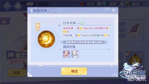 部分舞魂之间还会有特殊的羁绊,比如个性直率我行我素的天照大神,和她那性格温吞散漫的弟弟月读。当歌舞姬同时装备天照和月读的舞魂卡时,就能激活羁绊技能:日月同辉,给Sperfect判定增加额外的分数。