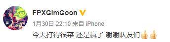 昨天FPX在让一追二击败SN,也成为LPL赛区中唯一一只不败的队伍。赛后FPX队员微博说道: