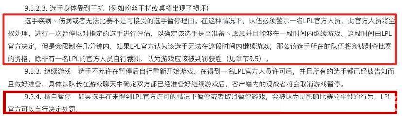 我们翻阅了2019年英雄联盟职业选手赛事规则发现,与之相关的规定是9.3.2.2以及9.3.4,内容如下:
