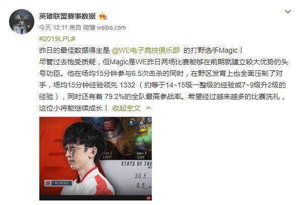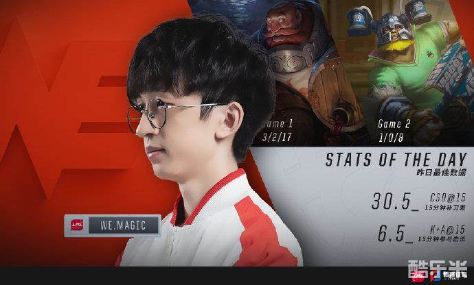 赛后,英雄联盟官方数据给出了这场比赛的赛事数据情况,其中WE战队的打野选手Magic表现出色,获得了昨天比赛中的最佳数据。