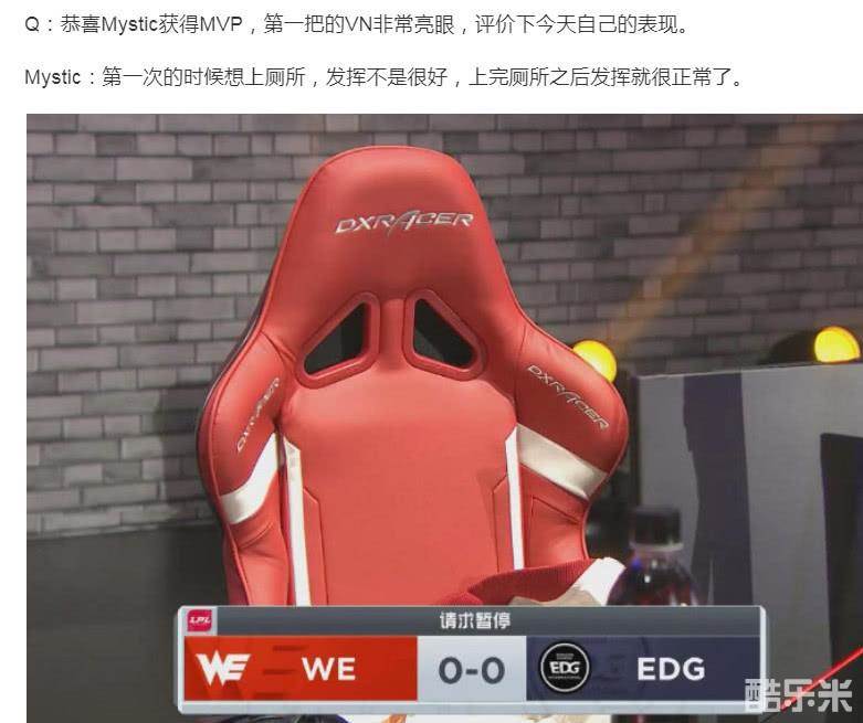 赛后Mystic接受媒体采访,媒体问他如何评价自己,Mystic开玩笑地说道:“第一场比赛想上厕所,发挥不是很好,上完厕所回来发挥就正常了!”毕竟人有三急,选手如果一直憋着,注意力会被分散,也没法正常发挥啦。所以Mystic上完洗手间之后神清气爽,找回了自己应有的状态。
