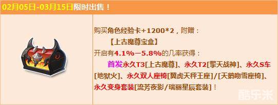 2月5日-3月15日期间,购买角色经验卡+1200*2,必得【上古魔尊宝盒】,有机会得首发特效永久T3【上古魔尊】、永久T2【擎天战神】、永久S车【地狱火】、永久双人座椅【翼虎天秤王座】/【天鹅吻雪座椅】、永久变身套装【流芳夜影/瑞丽星辰套装】!其中核心奖励概率为4.1%-5.8%,非核心奖励概率为94.2%-95.9%。