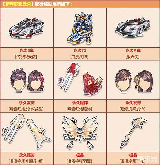 2月11日-3月23日,在飞车商城购买【角色经验卡+800】,赠送【新年梦想云朵】,开启有机会获得永久S车【终极银天使】、永久T1【白虎战神】、永久A车【银天使】、永久【缘喜红焰发型/发饰/服饰】/【澄泓挽卿发饰/礼裙/礼服】!其中核心极品期限型概率范围为:4%-6%,核心奖励永久型概率范围为:2%-4%,非核心奖励概率范围为:90%-94%!