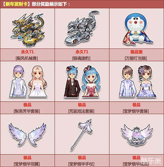 2月10日-3月22日,在飞车商城购买【角色经验卡+300】,赠送【新年发财卡】,开启有机会获得永久T1【裂风机械兽】/【银魂捷豹】、极品宠【万能叮当猫】、极品【梨洛芳华套装】/【荒诞戏法套装】/【莹梦烟华套装】!其中核心极品期限型概率范围为:4%-6%,核心奖励永久型概率范围为:2%-4%,非核心奖励概率范围为:90%-94%!