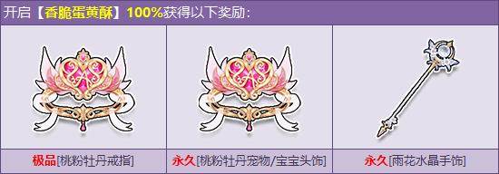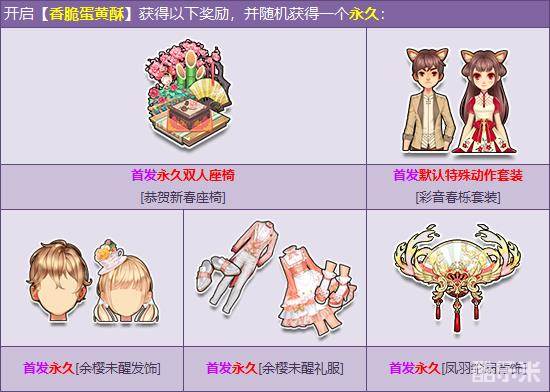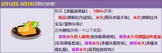 2月12日-3月15日,在飞车商城购买【香脆蛋黄酥】,开启100%获得【雨花水晶手饰】、【桃粉牡丹戒指】、【桃粉牡丹宝宝/宠物头饰】!且每个礼包随机一个以下永久极品奖励:首发永久双人座椅【恭贺新春座椅】、首发永久可爱猫动作套装【彩音春栎套装】、首发永久【余樱未醒发饰】、首发永久【余樱未醒礼服】、首发永久【凤羽纶扇背饰】。
